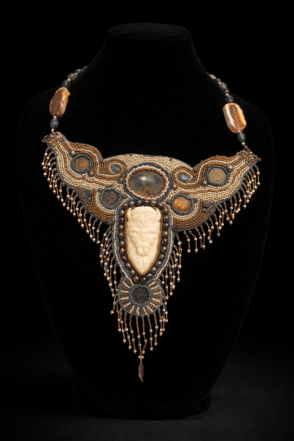 INCOMPLETE The white hand-carved buffalo is made of Water Buffalo Bone. It is surrounded by fresh water pearls and seed beads. A Peterisite Stone is flanked by five Indian Head Pennies. Petrified Wood———???? INCOMPLETE